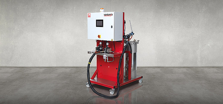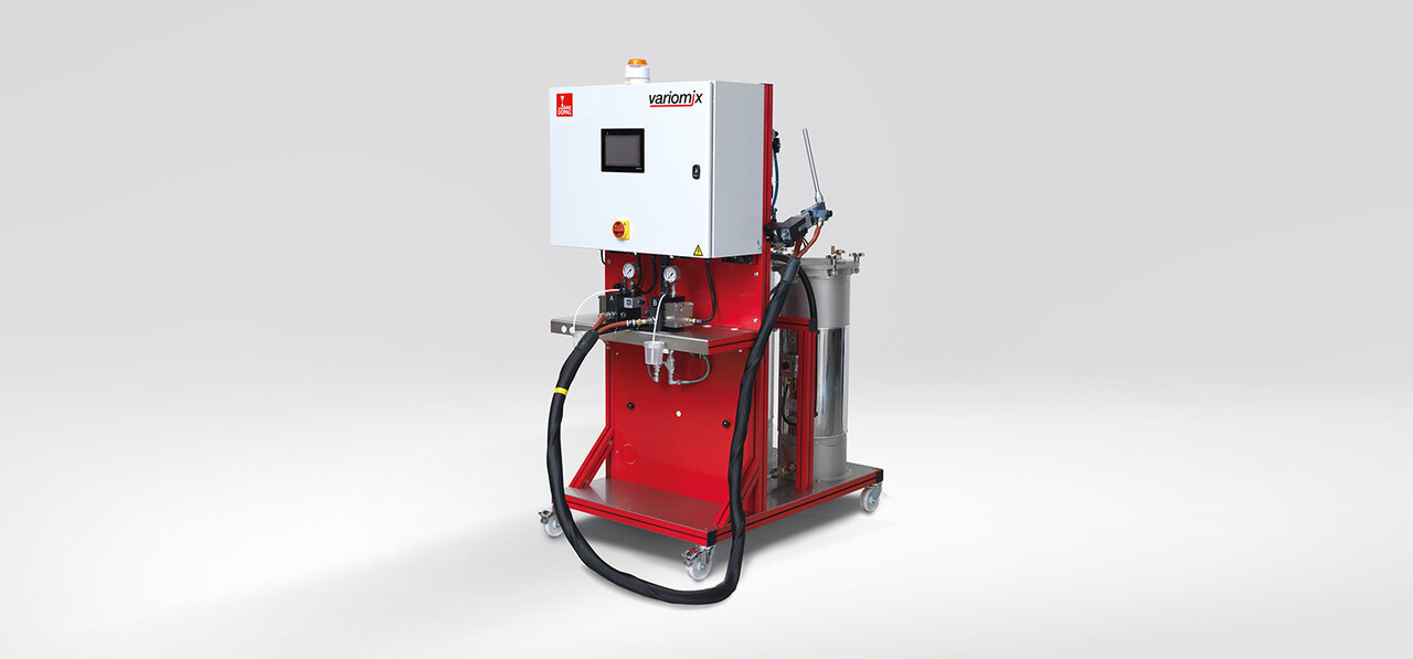 Un control de dosificación controla la máquina. Ello permite, por ejemplo, la integración en procesos de fabricación o montaje parcial o totalmente automatizados. Como sistema de descarga, la variomix A incorpora un sistema de mezcla estático formado por una válvula de 2 componentes en combinación con un tubo mezclador estático de plástico. La válvula dispone de un efecto de succión de retorno regulable sin escalonamiento que impide que el medio gotee tras completar la dosificación. El tubo mezclador puede desecharse de forma económica cuando el medio se endurece. Se prescinde de un lavado caro y contaminante.